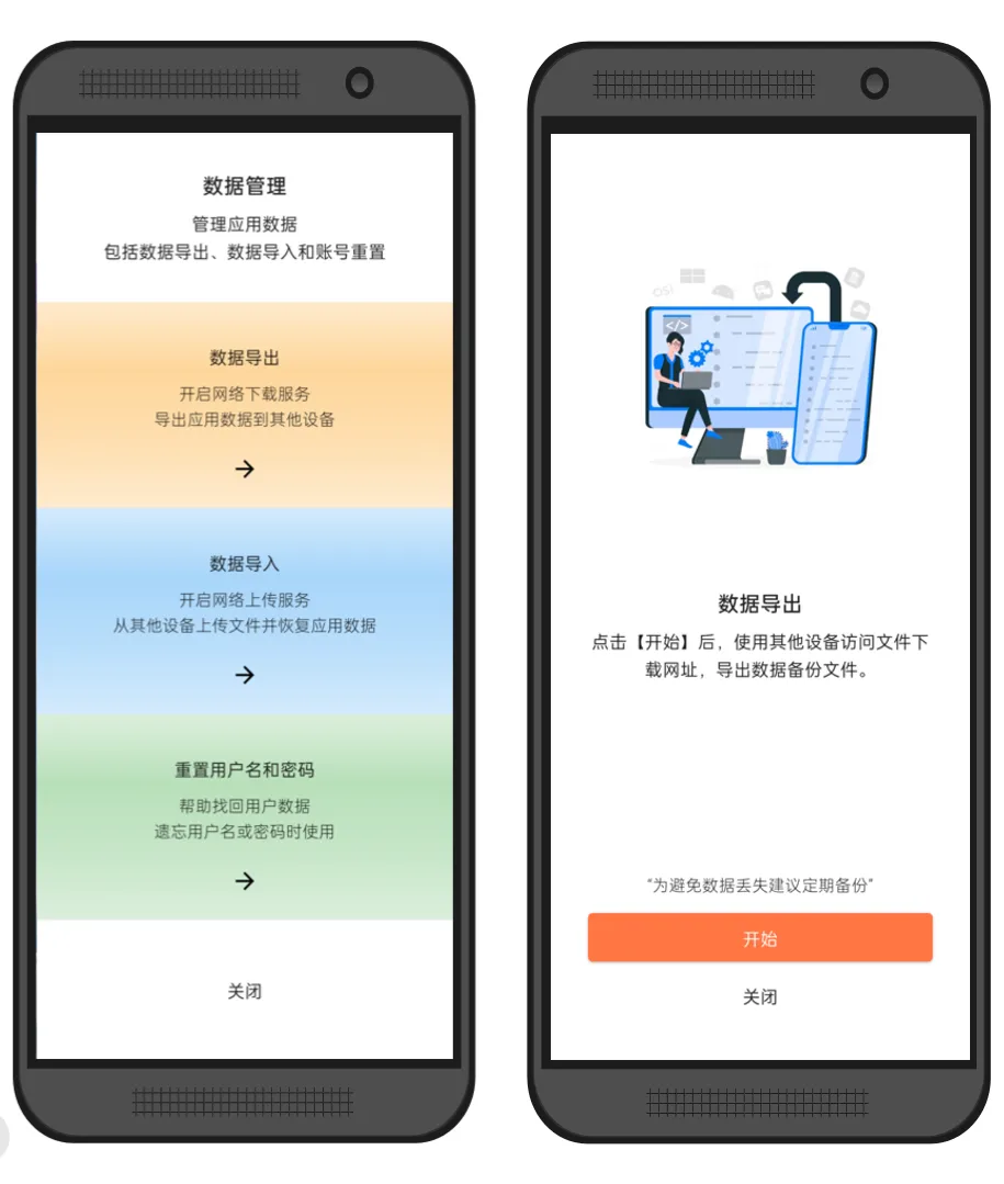 这里,可以对您的晓记内容及附件进行加密导出(备份)和导入(恢复),还可以在您忘记用户名和密码时进行重置