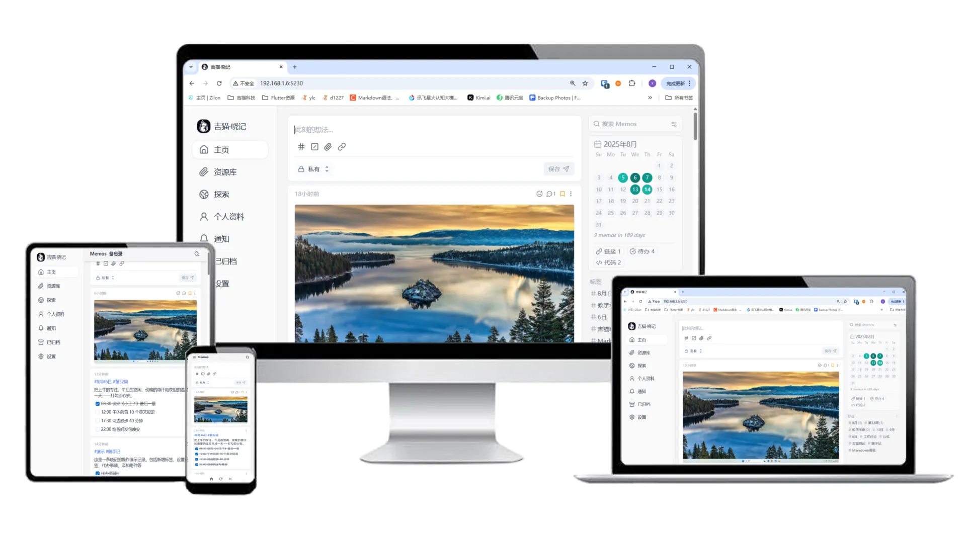 让您的电脑、平板、手机同步访问您的【吉猫·晓记】,在其他设备访问晓记内容时,手机进入【节能模式】,服务更稳定,手机更省电